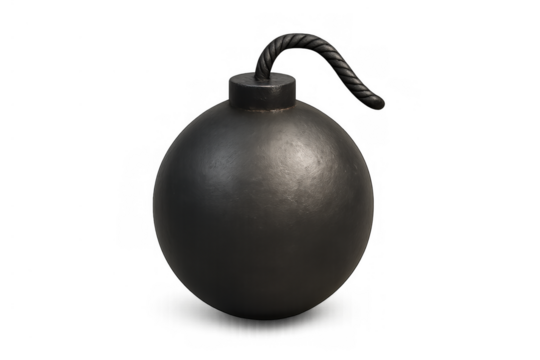 Black old-fashioned spherical bomb with lit fuse representing explosion, danger, risk, or a looming problem, transparent background