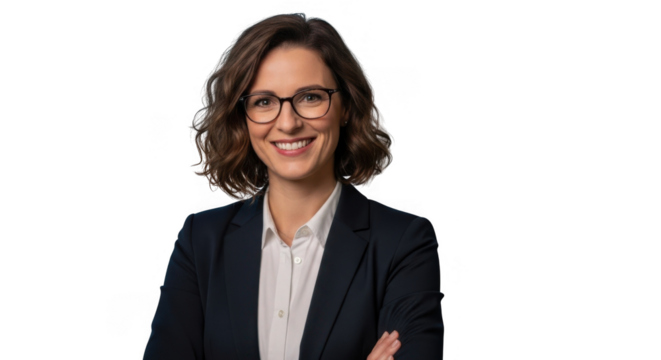Professional woman portrait in gray suit business attire headshot confident look on transparent background