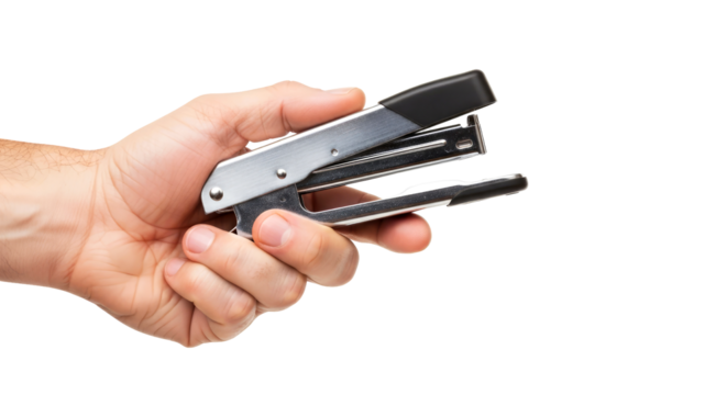 hand offering a silver stapler efficiency, productivity, and office organization, isolated on transparent background