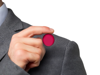 A businessman confidently holds a circular token on his shoulder, symbolizing commitment and professionalism in his attire.