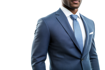 A professional man dressed in a tailored suit with a light blue tie, conveying confidence and elegance against a white background.