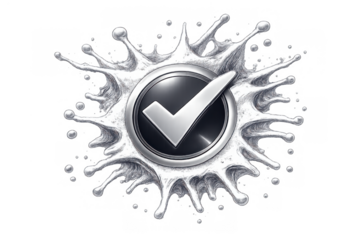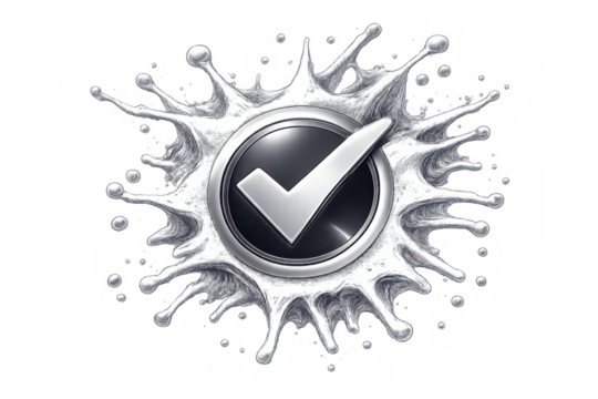 Check mark icon emerging from liquid silver splash, representing quality, verification, and success on transparent background