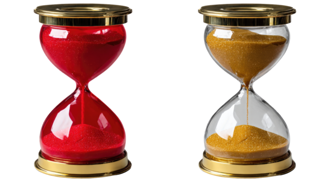 Time Management Concept: Two hourglass, one filled with red sand, the other with golden sand, representing different aspects of time management or the passage of time.