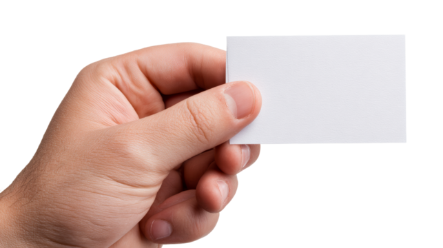 Closeup of a hand holding a blank business card isolated on transparent background, perfect for corporate, business, or branding mockups and design presentations.
