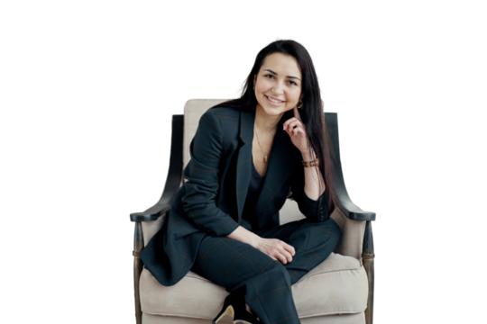 A business woman in formal clothes, sitting in an armchair, smiling and looking at the camera, transparent background.