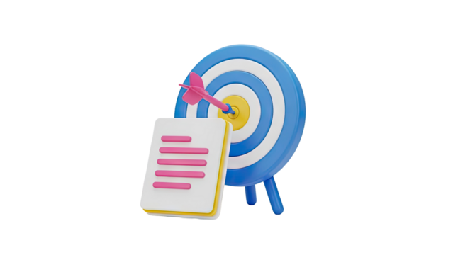3D Dart hitting target, document and goal achievement concept on transparent background