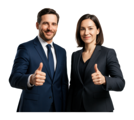 Smiling business couple with thumbs up gesture, isolated on transparent background. Success and teamwork concept