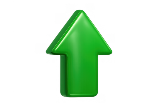 Green 3d arrow pointing up icon symbolizing increased progress, financial growth, business success, and upward direction with transparent background