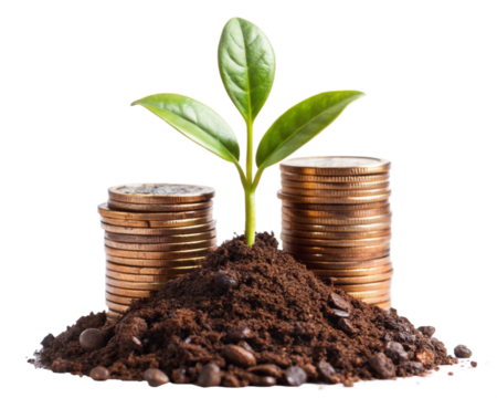Plant growing in coins, theme of business growth and investment, isolated on whiite