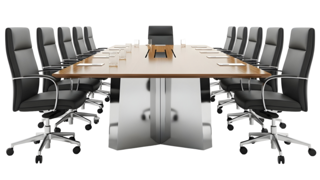 Modern conference room featuring a large table and office chairs, ideal for corporate meetings and professional workspace visuals.