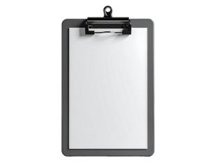 A dark gray clipboard with a blank white sheet of paper.  A metal clip secures the paper