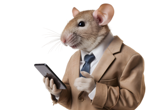 mouse businessman in suit use mobile phone isolated on transparent background