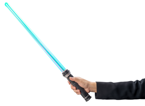Strategy concept,Businessman Hand holding Blue Lightsaber on white background, Hand Holding reflective sword on White PNG File.