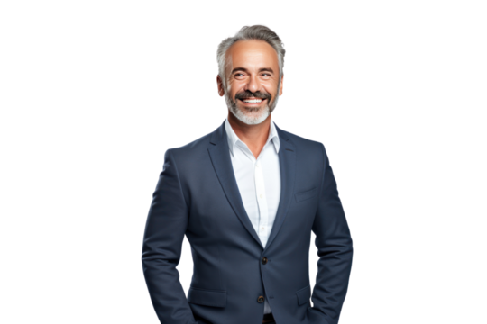 Happy middle-aged businessman CEO stands with arms crossed, smiling confidently. isolated on transparent background,png file