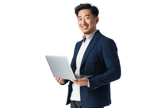 A smiling businessman holding a laptop and talking on the phone, looking successful and professional, isolated on transparent background