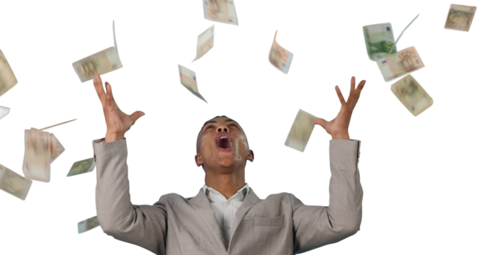 Money rain, celebration and excited businessman with poker award on isolated, transparent or png background. Cash, splash and male winner with investment, success or startup profit growth or savings