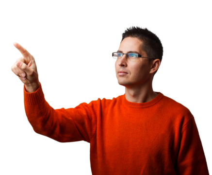closeup man pointing up with his finger or pressing something isolated on white background with clipping path. copy space.