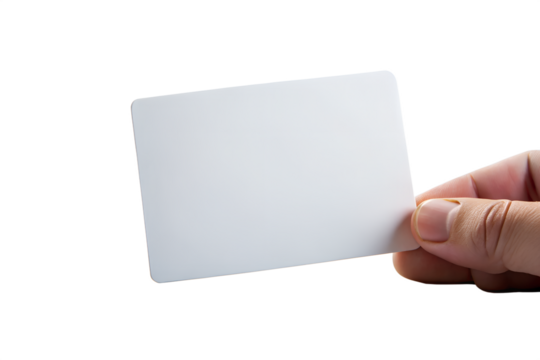 Male hand holding blank white card mockup on transparent background, high-resolution PNG cutout, realistic skin detail, right-hand close-up, copy space for logo or text, business card or ID badge