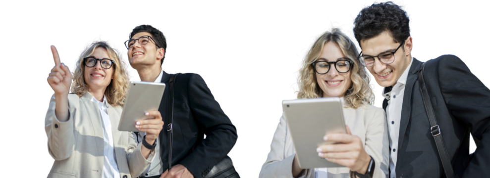 Successful business people colleagues meeting a woman and a man use a tablet. The managers of the startup team work online in business suits. Isolated background.