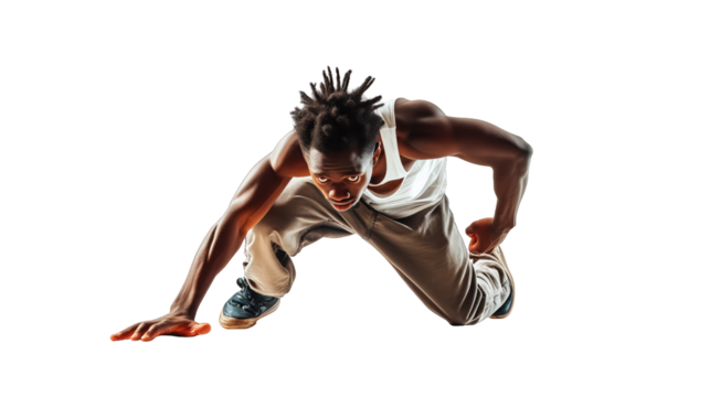 black man breakdancing with hand on floor, on transparent background