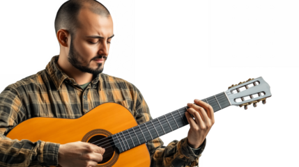 A musician holding a guitar with a relaxed posture isolated on a transparent background