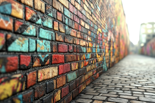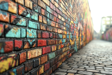 A Vibrant Urban Alleyway Bursts With Color, A Kaleidoscope Of Graffiti Art Adorning A Weathered Brick Wall, Showcasing A Street Artists Bold Expression In A Sun-drenched Perspective Isolated on Transp