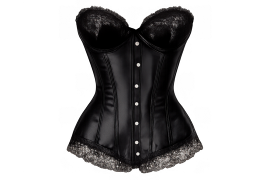 Black leather corset with lace trim and white buttons, portraying gothic fashion style, intimate apparel for women, transparent background