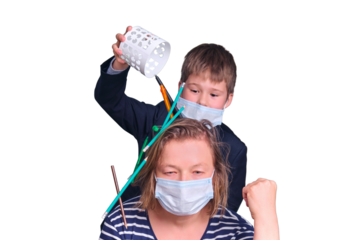 The child interferes with the mother behind the laptop at remote work in the face mask, isolated on a white background