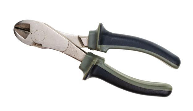 old diagonal cutting pliers with green and black rubber handle isolated on white background