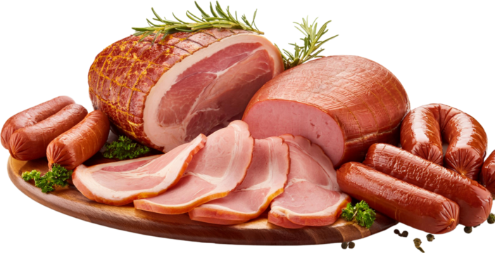 Delicious Smoked Ham Sausages Bacon Slices on Wooden Board