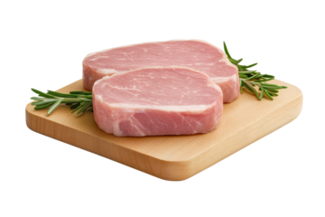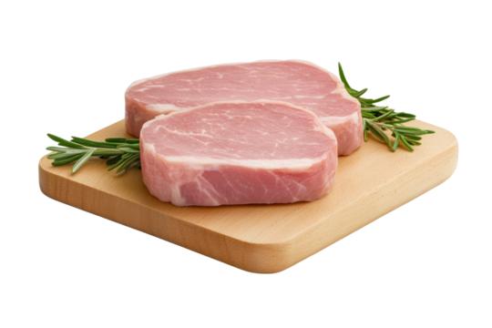 Two pieces of meat with rosemary on top of a wooden cutting board, isolated