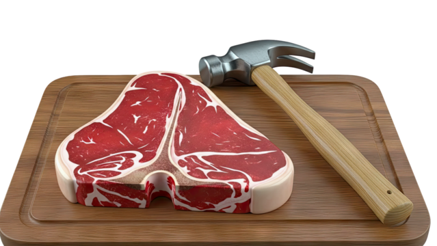 T-bone steak and hammer on a wooden cutting board