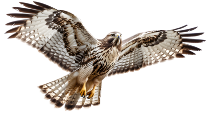Red-tailed hawk flying with wings spread, a bird of prey in predatory flight, isolated on transparent background