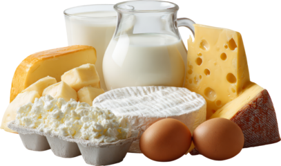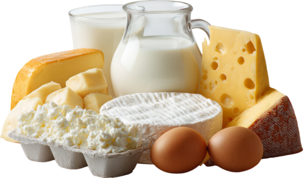 Creamy dairy selection milk cheese butter eggs, fresh wholesome nutrition concept