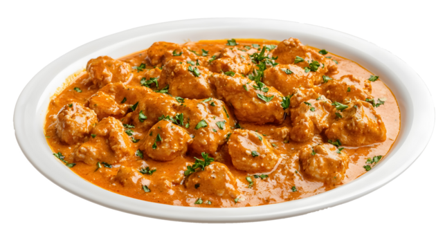Delicious creamy butter chicken curry traditional Indian food meal isolated on transparent background ready to eat