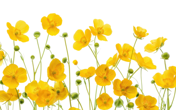 Vibrant yellow buttercup flowers on green stems. transparent background