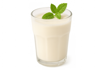 Glass of refreshing lassi drink with green mint leaves, representing probiotic dairy beverage, on transparent background