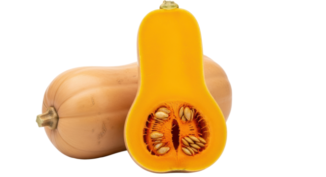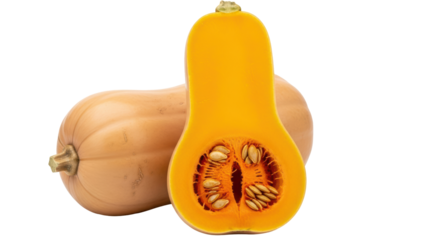 Fresh Butternut Squash Still Life: Whole and Halved Pieces with Seeds and Vibrant Orange Pulp on Transparent Backdrop for Healthy Cooking