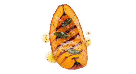 Grilled butternut squash slice with sage and oil droplets on black orange food
