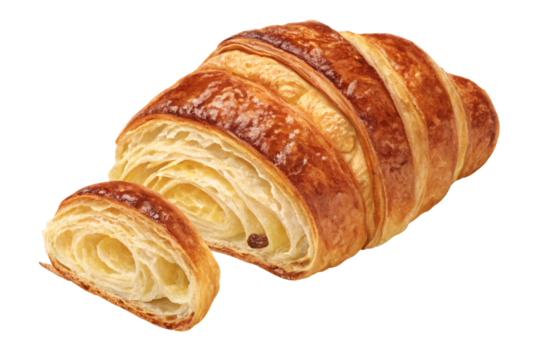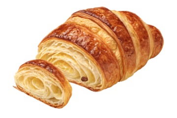 Sliced golden croissant showing flaky layered pastry with buttery texture and crispy exterior crust, isolated on a transparent background