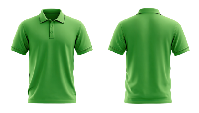 Front and back view of a plain white polo shirt.  Short sleeves, collared,  button placket.  Detailed mockup