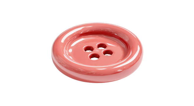 A close-up studio shot presents a single, glossy, coral-colored sewing button against a stark, black background. It features four eyelets