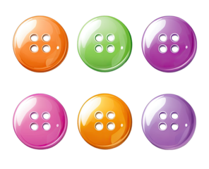 Colorful sewing buttons scattered, displaying diverse shapes and hues against transparent backdrop, highlighting crafting potential