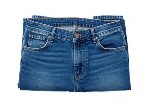 A pair of folded blue denim jeans with pockets and a button closure isolated on transparent background