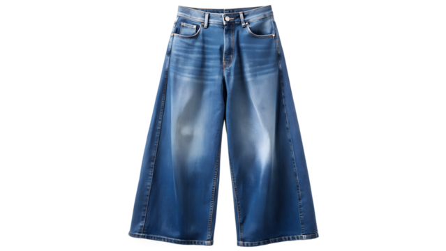 Stylish wide leg denim jeans in a classic blue wash isolated on transparent background, perfect for a trendy and comfortable casual look