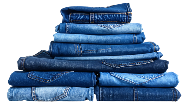 Stylish denim jeans collection showcasing various fits and shades on isolated transparent background