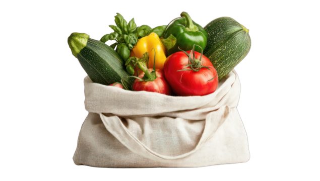 Overhead shot of realistic shopping basket packed with fresh groceries, background isolated on a Transparent background, PNG file.