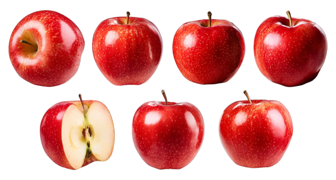 A collection of fresh, shiny red apples, showcasing whole and sliced varieties, perfect for health and nutrition themes.