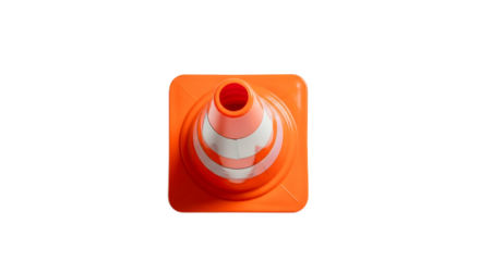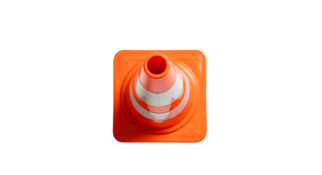Flat lay perspective of a vibrant orange traffic cone with distinct white reflective bands, presented in a clean, high-angle shot isolated on a crisp white background to signify safety and caution