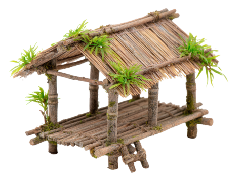 Small bamboo hut miniature tiki cabana with rustic wood texture, isolated on transparent background.